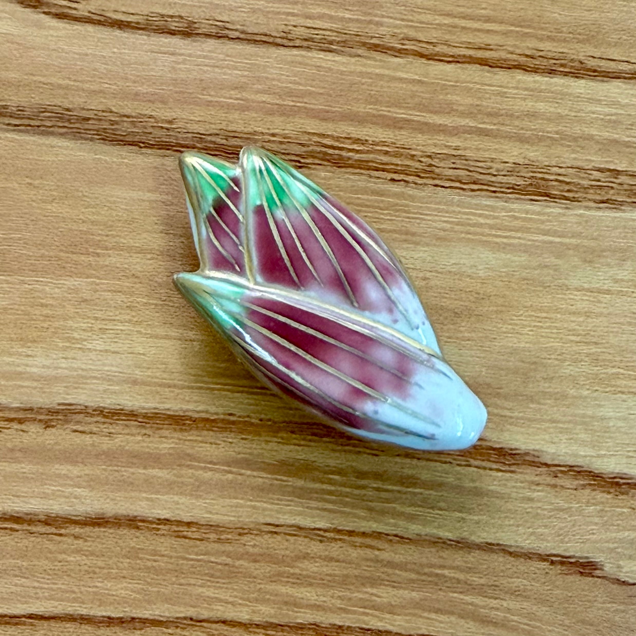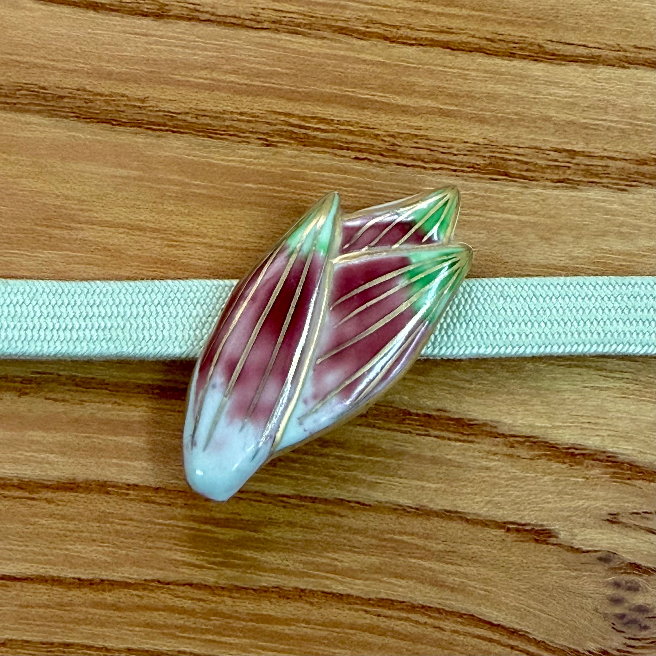茗荷 陶芸家五福香菜子の作品。 清水焼の技法で陶器に色絵を施しています。 陶製 手描イラストの桐箱入り 桐箱の内寸 5.3×5.3㎝ 大きさの参考に三分紐(幅9mm)の上に置いて撮影しました。 (紐は付属しておりません。) 手作り手描きの為、少しづつ大きさや形が異なります。 ご了承ください。 裏の金具をブローチに変更できます。ご希望の場合は備考欄にご記入ください。