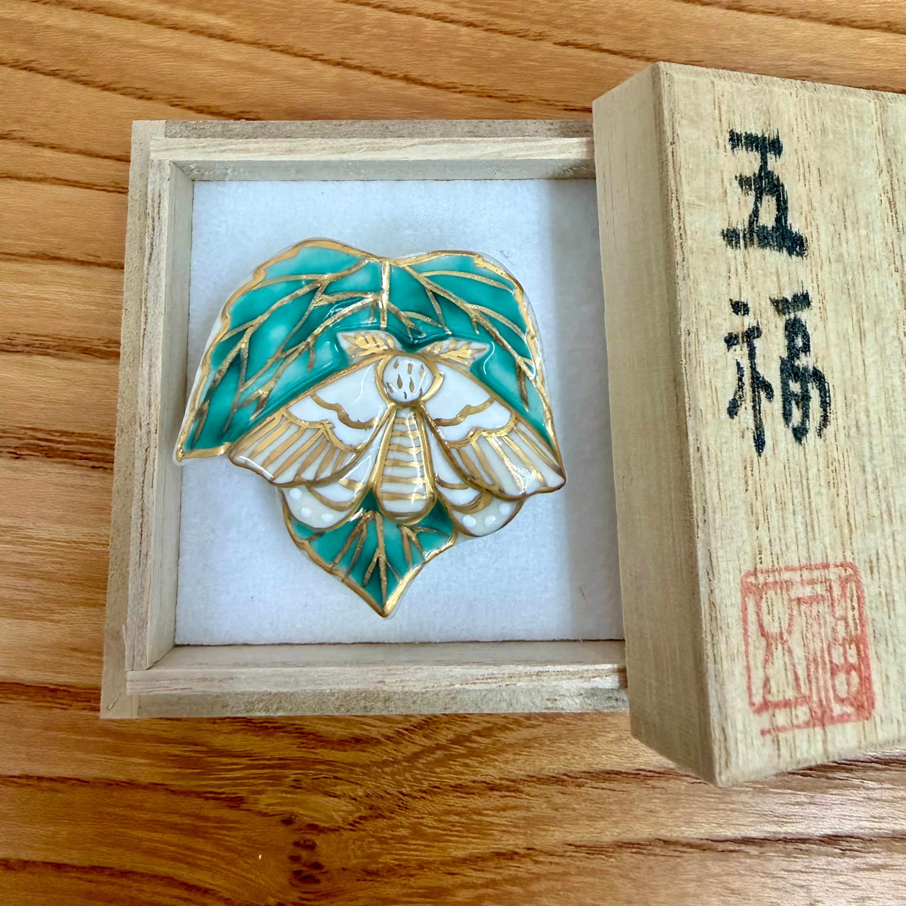 桑の葉っぱに蚕 陶芸家五福香菜子の作品。 清水焼の技法で陶器に色絵を施しています。 陶製 手描イラストの桐箱入り 桐箱の内寸 5.3×5.3㎝ 大きさの参考に三分紐(幅9mm)の上に置いて撮影しました。 (紐は付属しておりません。) 手作り手描きの為、少しづつ大きさや形が異なります。 ご了承ください。 裏の金具をブローチに変更できます。ご希望の場合は備考欄にご記入ください。