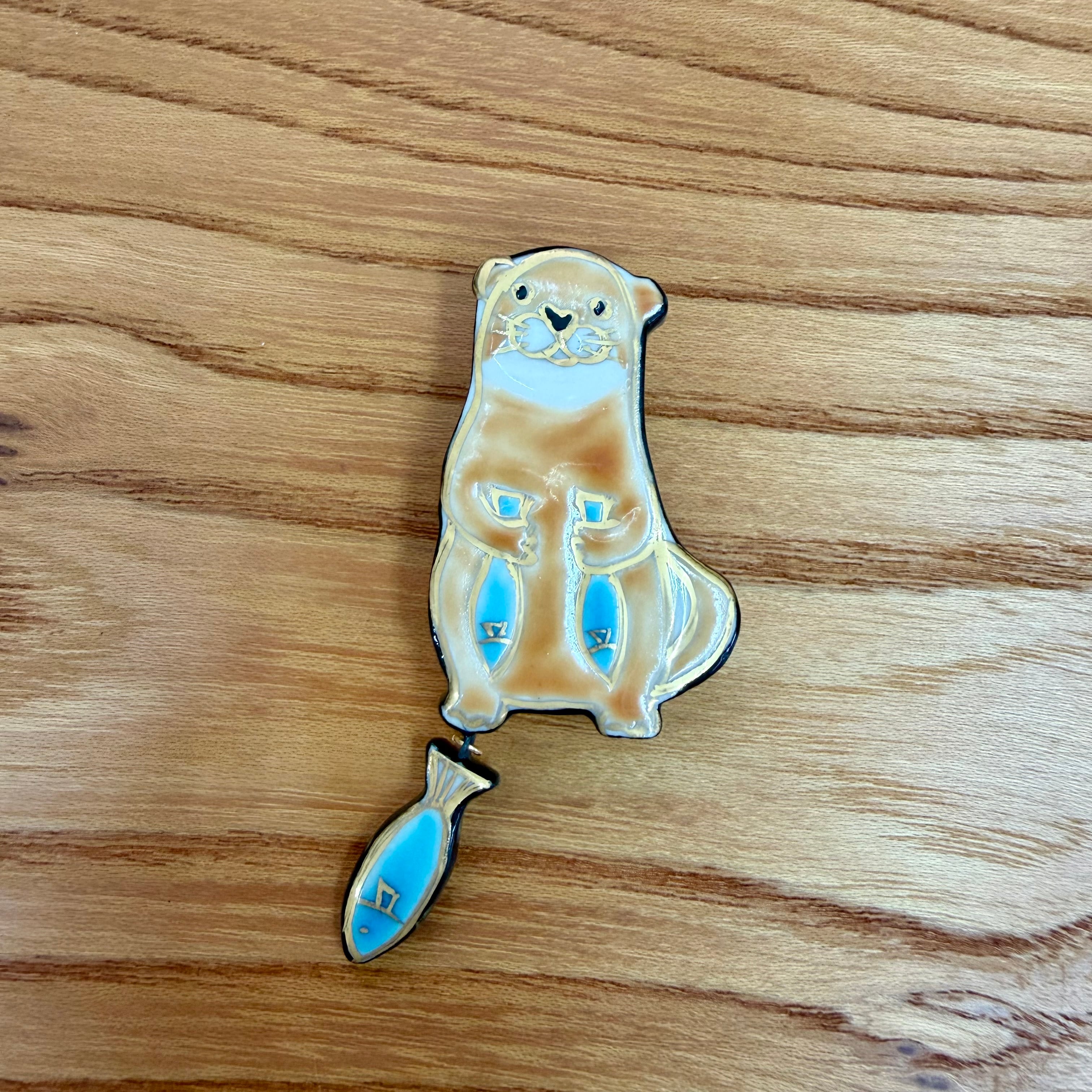 カワウソ 陶芸家五福香菜子の作品。 清水焼の技法で陶器に色絵を施しています。 陶製 手描イラストの桐箱入り 桐箱の内寸 5.3×5.3㎝ 大きさの参考に三分紐(幅9mm)の上に置いて撮影しました。 (紐は付属しておりません。) 手作り手描きの為、少しづつ大きさや形が異なります。 ご了承ください。 裏の金具をブローチに変更できます。ご希望の場合は備考欄にご記入ください。