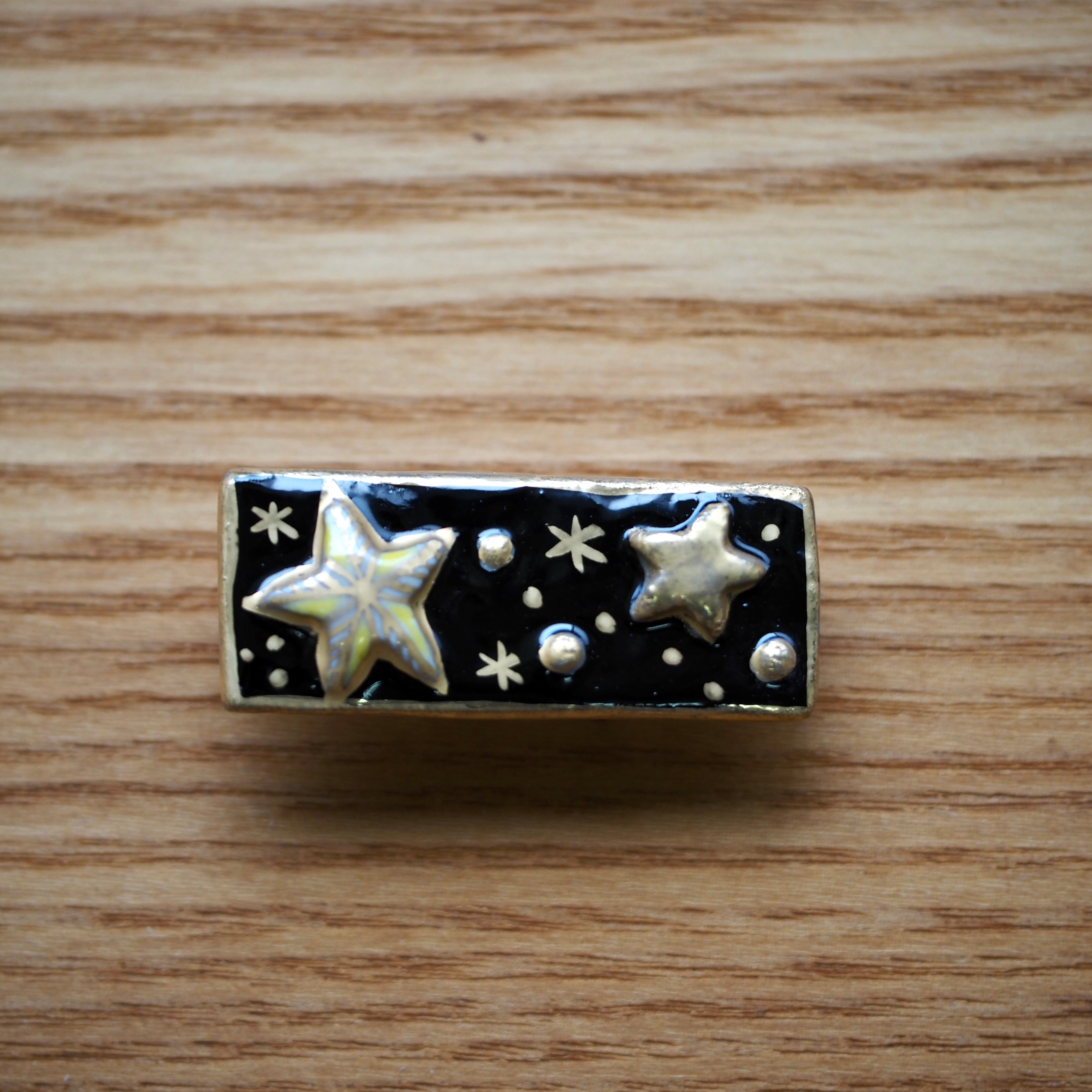 リネ星屑 陶芸家五福香菜子の作品。 清水焼の技法で陶器に色絵を施しています。 陶製 手描イラストの桐箱入り 桐箱の内寸 5.3×5.3㎝ 大きさの参考に三分紐(幅9mm)の上に置いて撮影しました。 (紐は付属しておりません。) 手作り手描きの為、少しづつ大きさや形が異なります。 ご了承ください。 裏の金具をブローチに変更できます。ご希望の場合は備考欄にご記入ください。