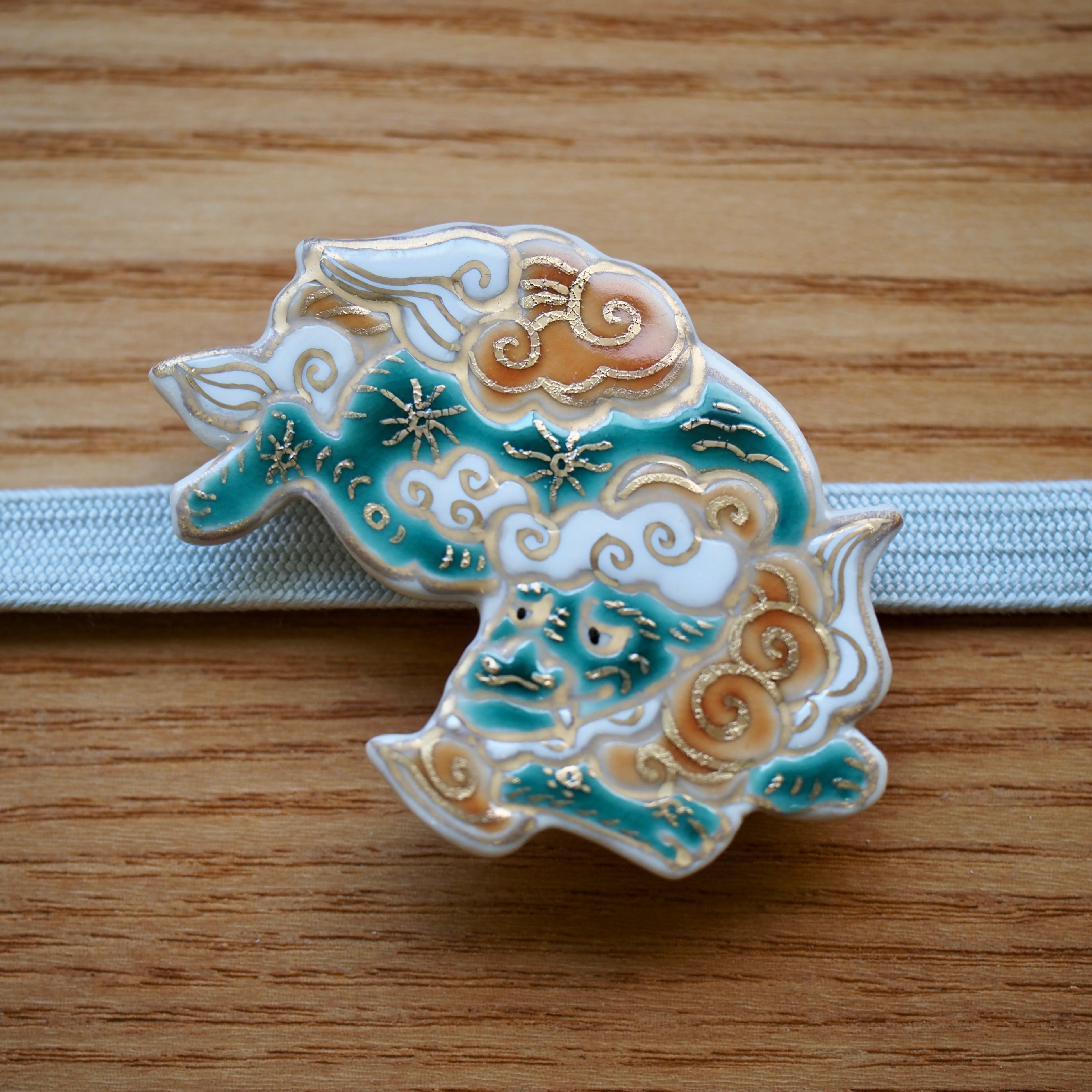 唐獅子 陶芸家五福香菜子の作品。 清水焼の技法で陶器に色絵を施しています。 陶製 手描イラストの桐箱入り 桐箱の内寸 5.3×5.3㎝ 大きさの参考に三分紐(幅9mm)の上に置いて撮影しました。 (紐は付属しておりません。) 手作り手描きの為、少しづつ大きさや形が異なります。 ご了承ください。 裏の金具をブローチに変更できます。ご希望の場合は備考欄にご記入ください。