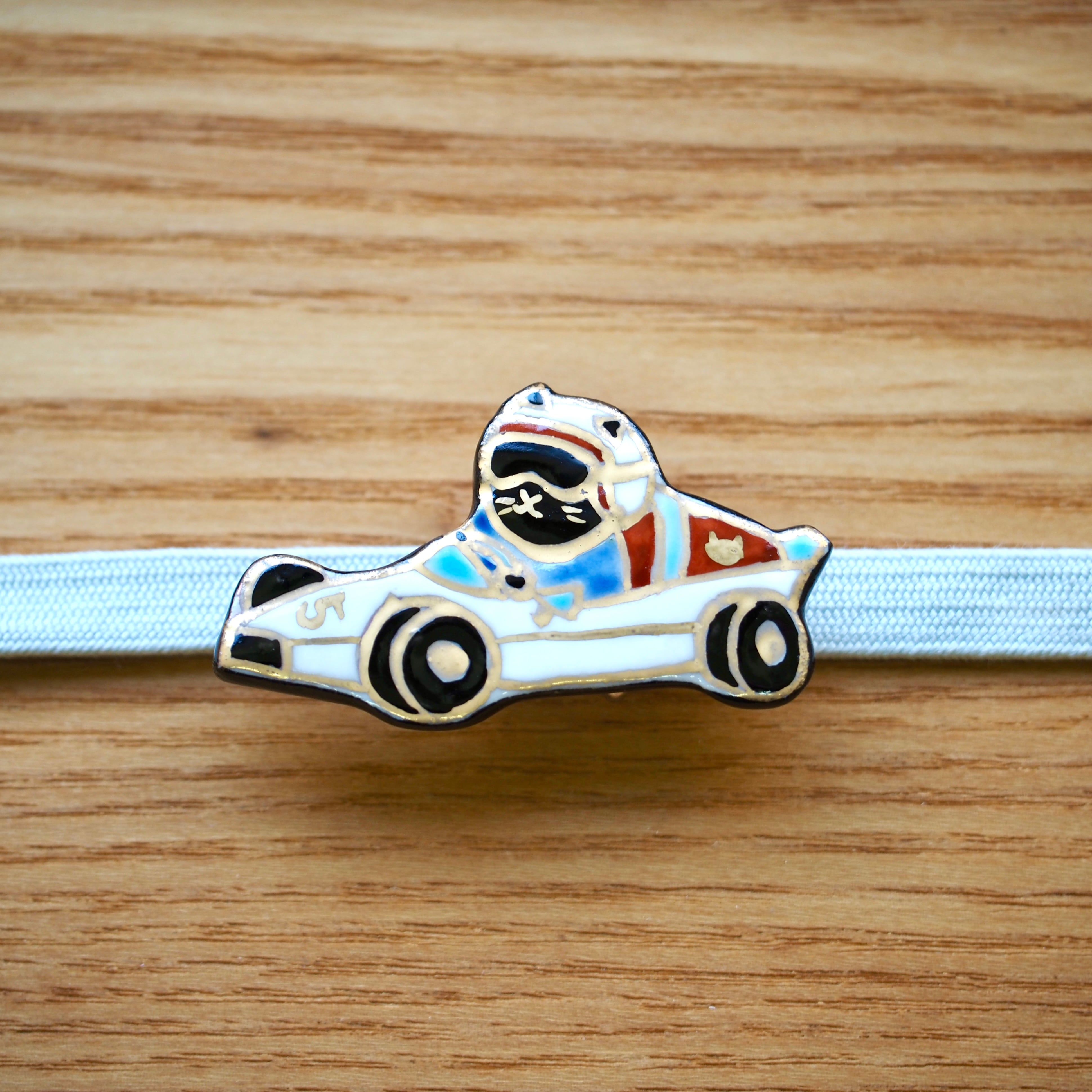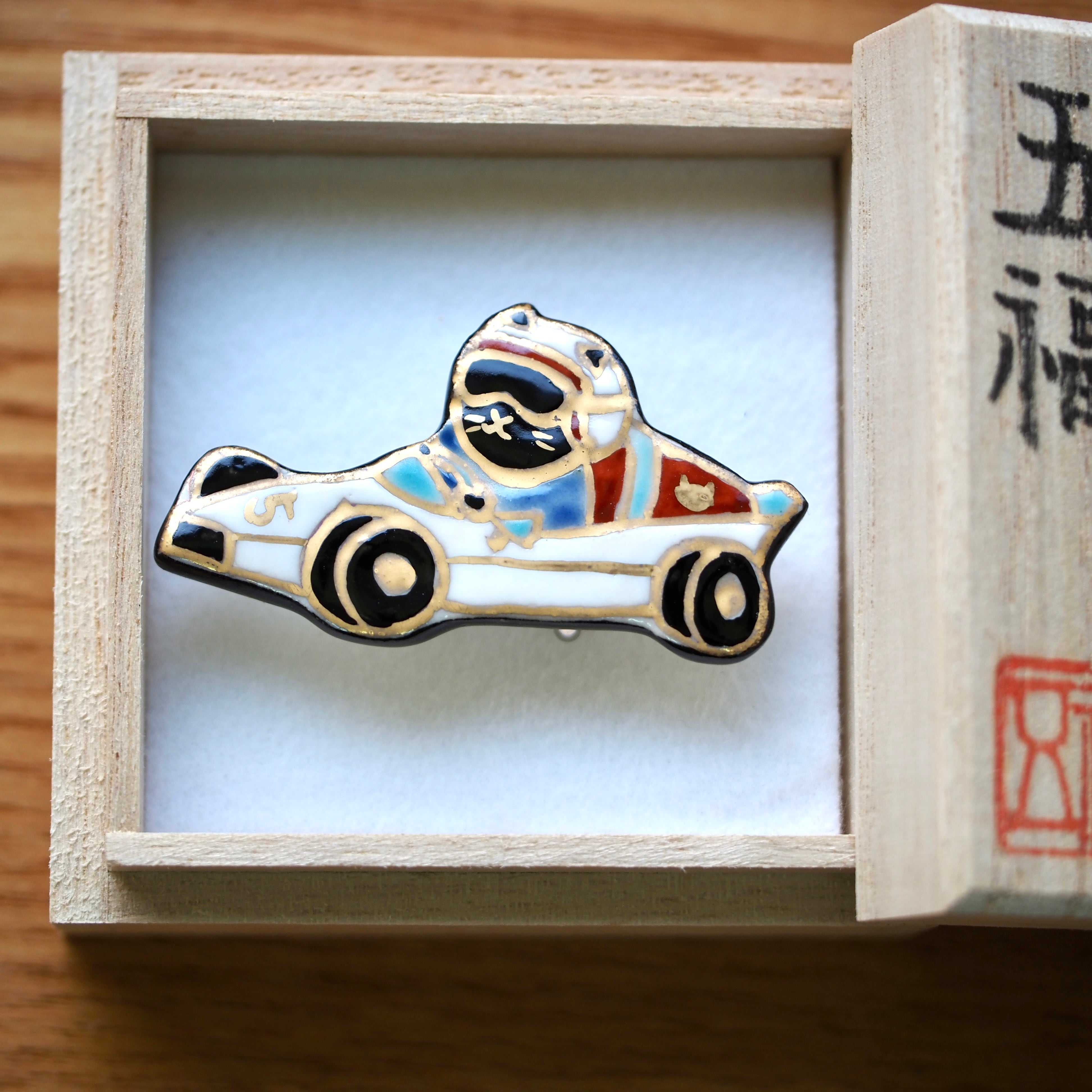 レーサー猫 陶芸家五福香菜子の作品。 清水焼の技法で陶器に色絵を施しています。 陶製 手描イラストの桐箱入り 桐箱の内寸 5.3×5.3㎝ 大きさの参考に三分紐(幅9mm)の上に置いて撮影しました。 (紐は付属しておりません。) 手作り手描きの為、少しづつ大きさや形が異なります。 ご了承ください。 裏の金具をブローチに変更できます。ご希望の場合は備考欄にご記入くだい。