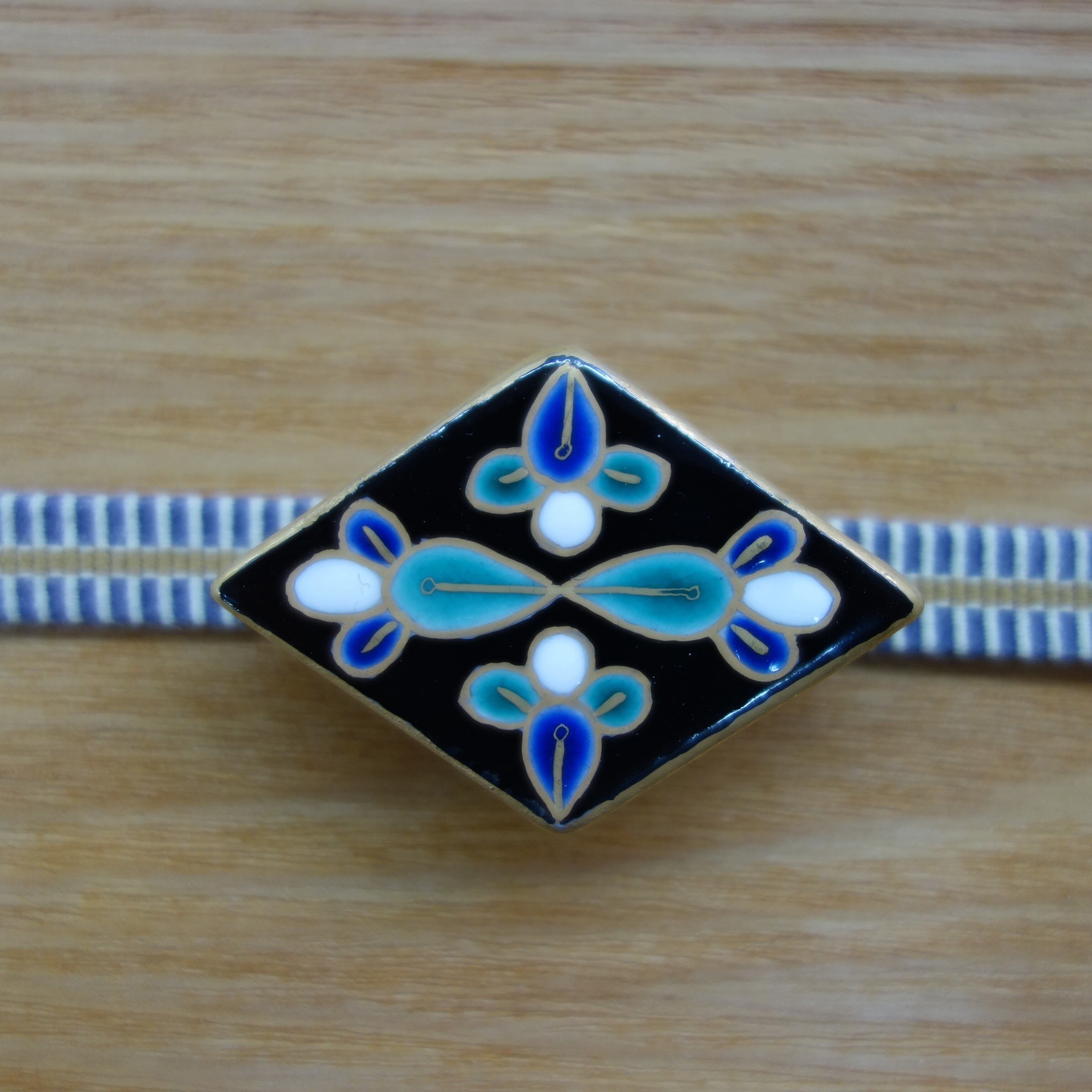 丁子文 陶芸家五福香菜子の作品。 清水焼の技法で陶器に色絵を施しています。 陶製 手描イラストの桐箱入り 桐箱の内寸 5.3×5.3㎝ 大きさの参考に三分紐(幅9mm)の上に置いて撮影しました。 (紐は付属しておりません。) 手作り手描きの為、少しづつ大きさや形が異なります。 ご了承ください。 裏の金具をブローチに変更できます。ご希望の場合は備考欄にご記入ください。